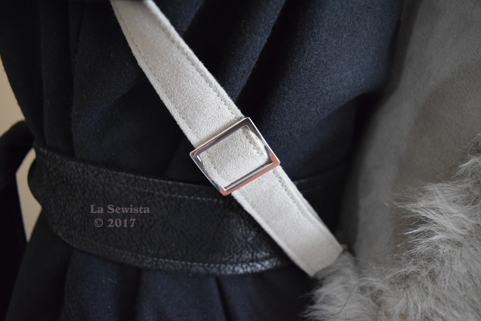 Straps were topstitched with regular C&C thread and a triple stitch. I went slow doing this and it took a while but the stitches came out better for it. I did not topstitch all areas spec'd. Those right next to the fur wouldn't show and it was an area of much bulk.