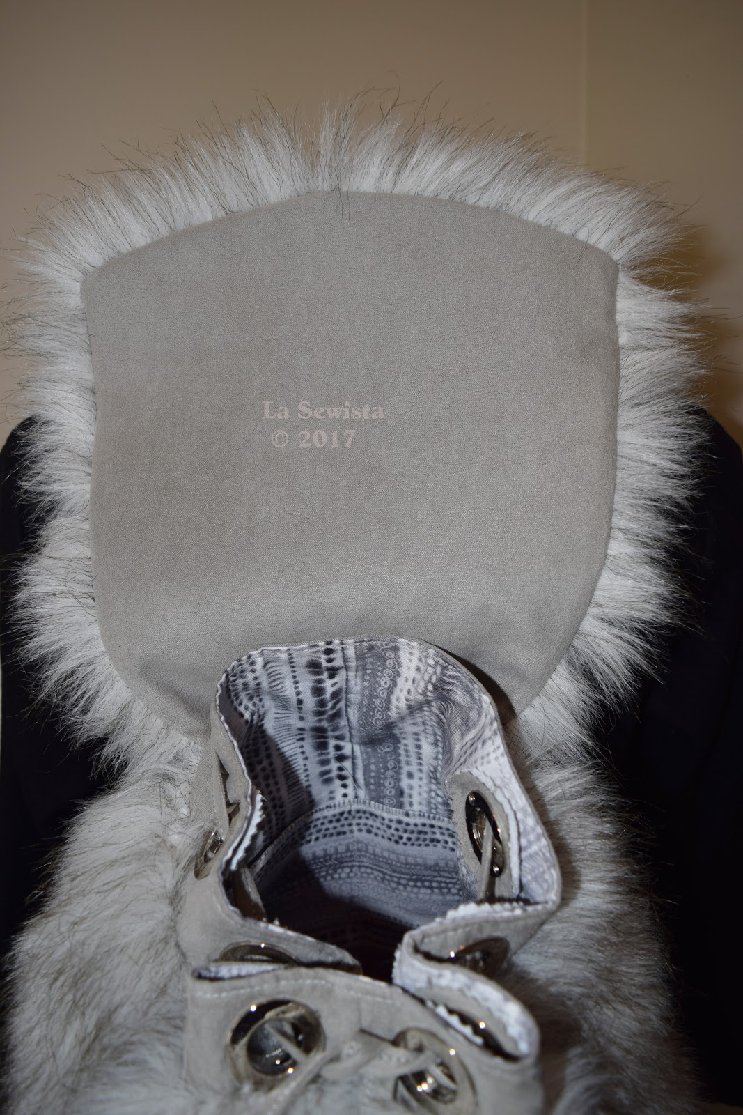 Interfacings used were different from what the pattern spec'd. Everything, including the lining got fused with SF101, standard bag interfacing. Obviously I couldn't interface the fur but ahead speak to how I managed that. The flap and the bag bottom got a layer of Peltex. Can you imagine the bulk? I have a work around I'll share in a minute. One thing I did not do, which would have been nice but I couldn't do it at the stage I realized it was to fill the grommet band with maybe Decor Bond. Peltex would not have bent enough for the gathered up edge.