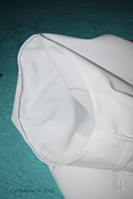This is made with a Joann's classic. I didn't know how the pattern would work out so was not ready to invest my good white linen into the top just yet. I went for the tried and true Symphony Broadcloth from Joann's. It's bargain fabric but I have used it before and knew what I was getting into. It is a 65 Poly, 35 cotton blend, best of both worlds? It's highly washable and quite tough, too. I find the white stays nice and white in our mineral loaded water. Synthetics don't do as badly as all natural fibers so it will have a bit longer life. The fabric also requires little ironing which is a two headed monster. This quality makes it difficult to ease and makes it hard to press away imperfections, like those of hand stitches.
