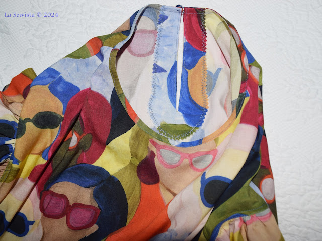 I could wear it now with a turtleneck underneath but will save this for warmer weather. The fabric is Lady McElroy and it is called "EPIC Spectacles". Make sure if you order it you ask for Epic as you may get the tiny faces as I did on the first purchase! Stone Mountain and Daughter carry it and were the ones to eventually provide me with the Epic version and were great to do business with. For the ruffles I simply cut a six inch wide strip the length of the sleeve opening and made that double the length of that opening. Next I sewed the short ends together. It was then folded in half, pressed and then gathered and applied to the opening, very simple basic ruffle technique. Seams on here were French seams except for the ruffle attachment which were machine stitched then serged.